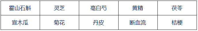 黃芪、柴胡、元胡、丹參、附子、杜仲、天麻、豬苓、黃芩、山茱萸