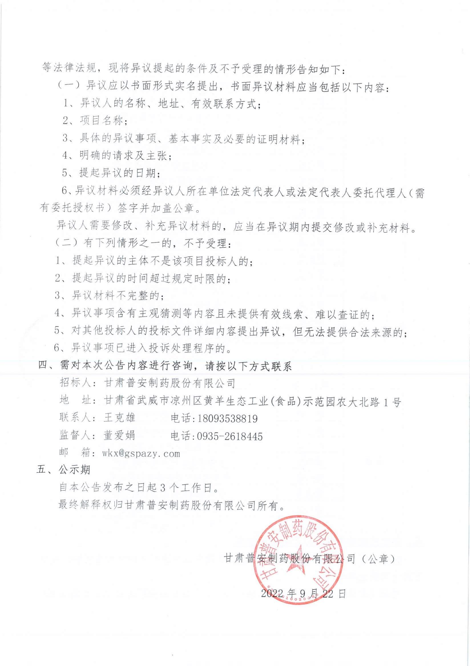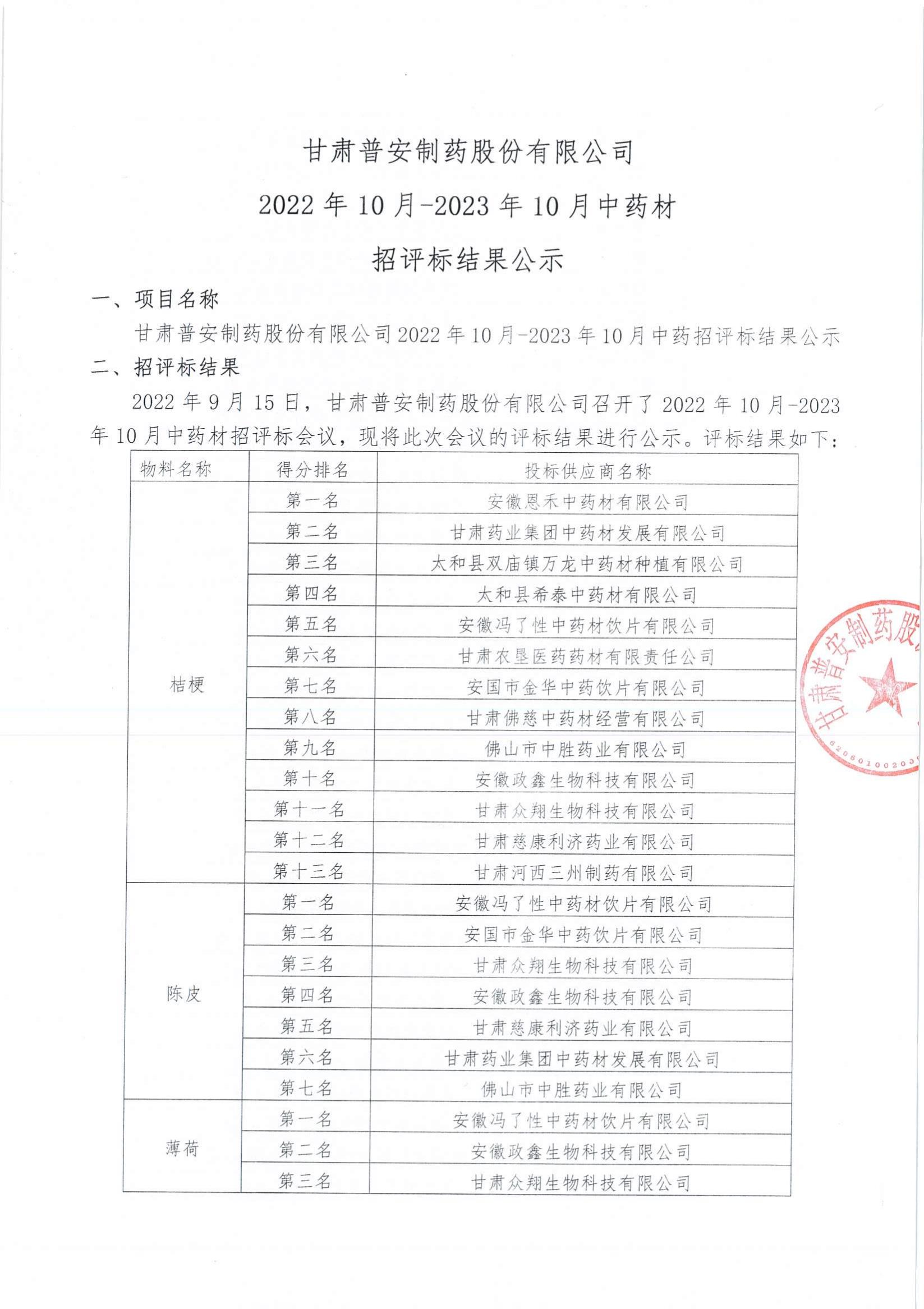 甘肅普安制藥股份有限公司2022年10月-2023年10月中藥材招評標結果公示