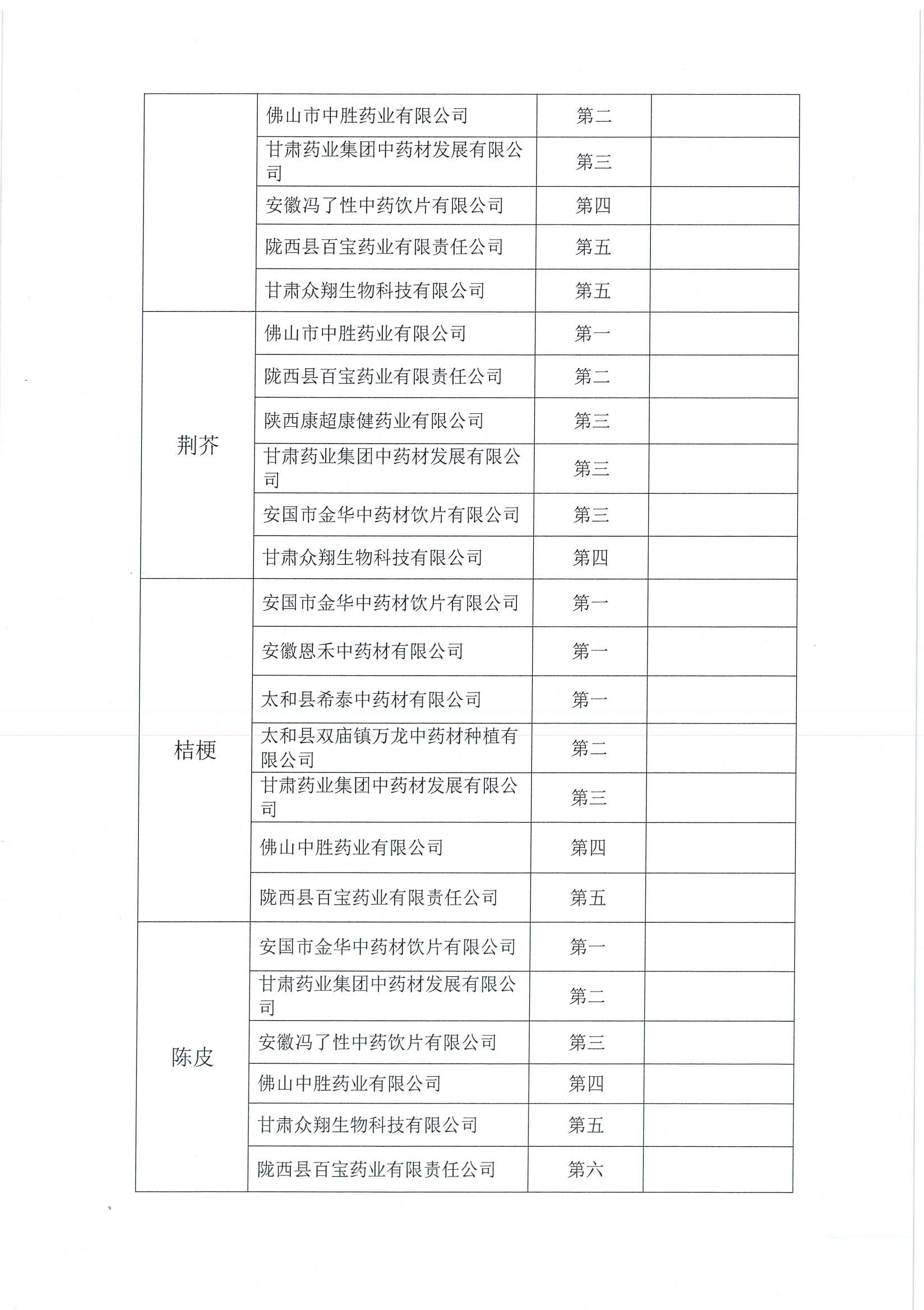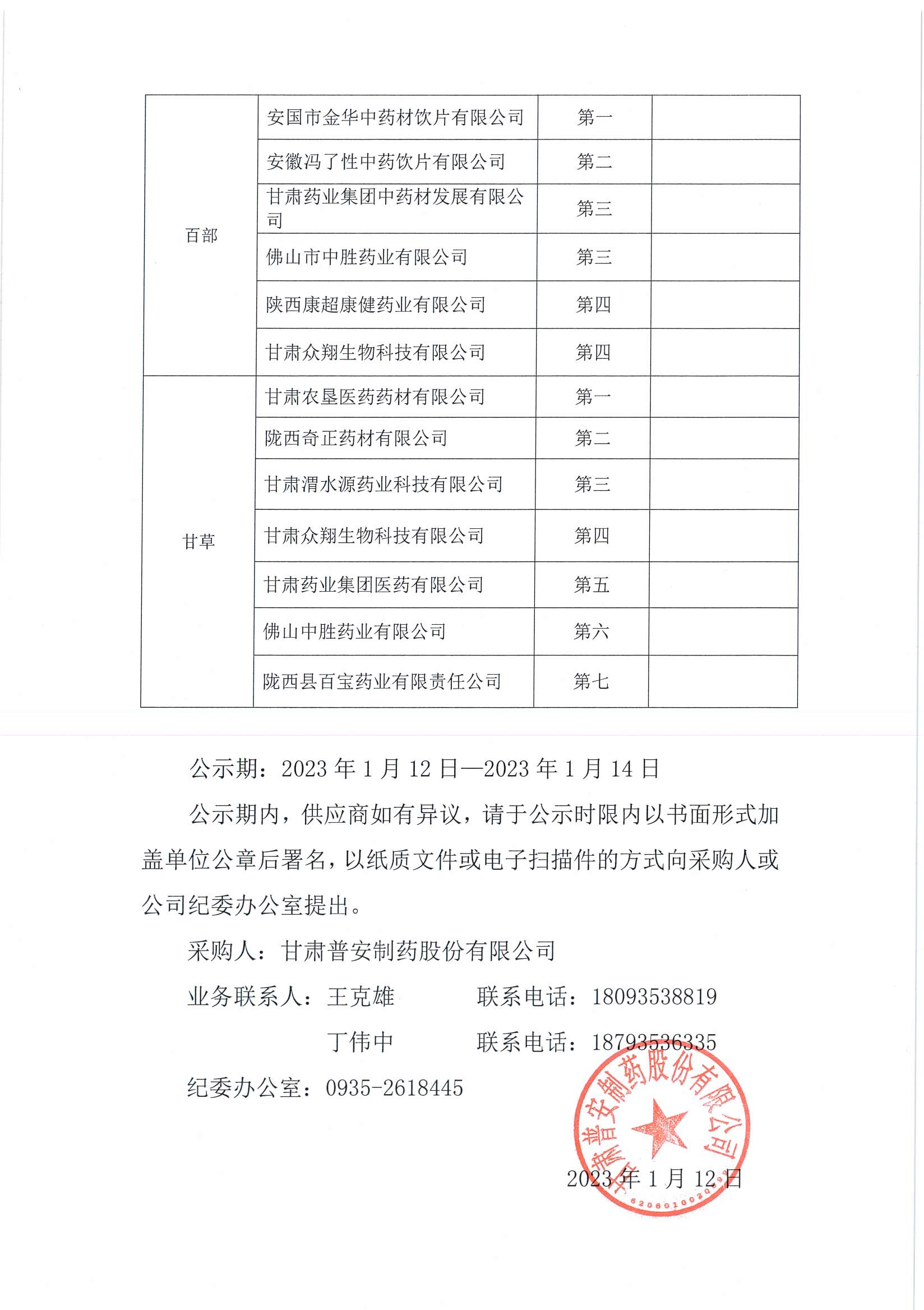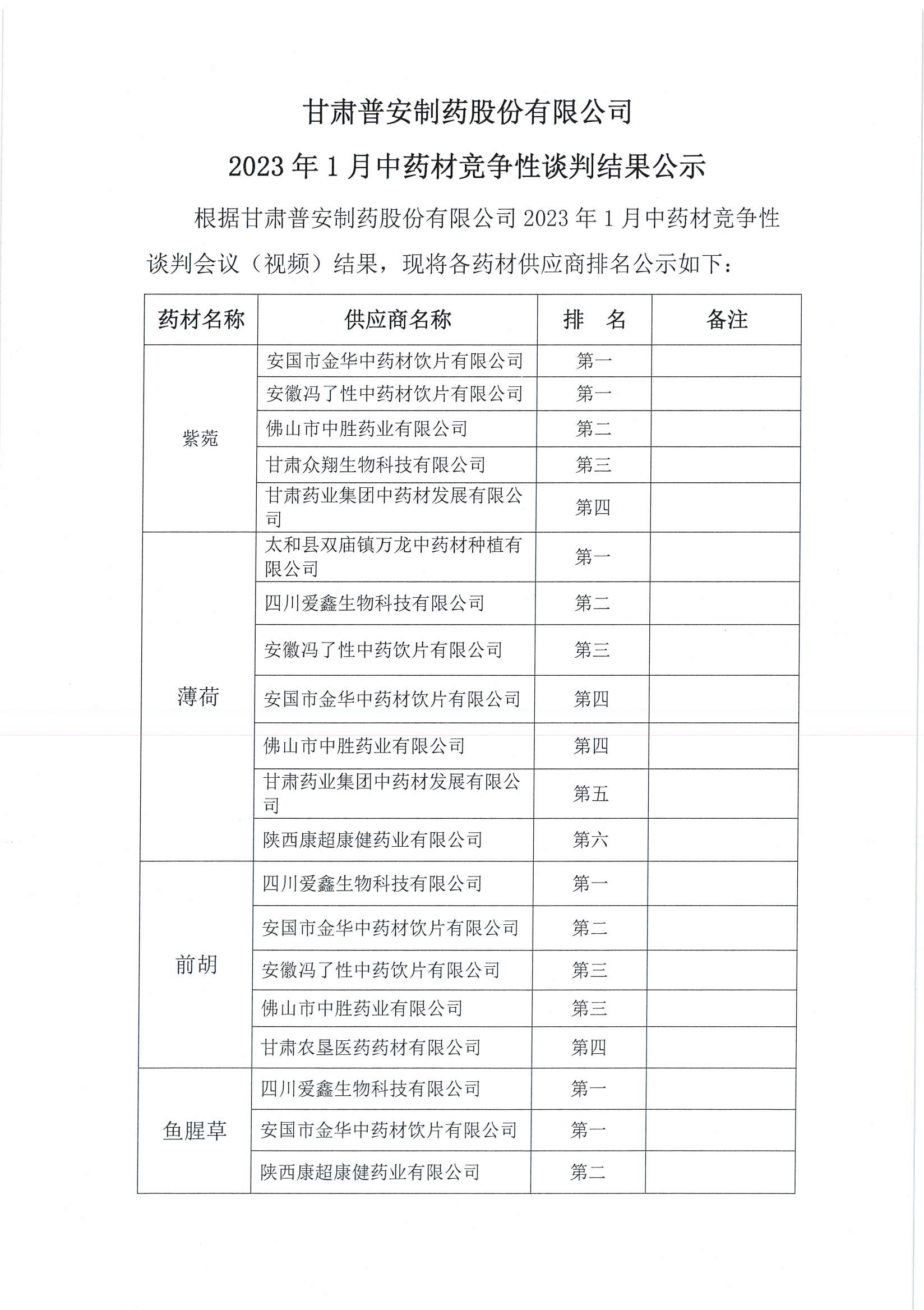 甘肅普安制藥股份有限公司2023年1月中藥材競爭性談判結果公示