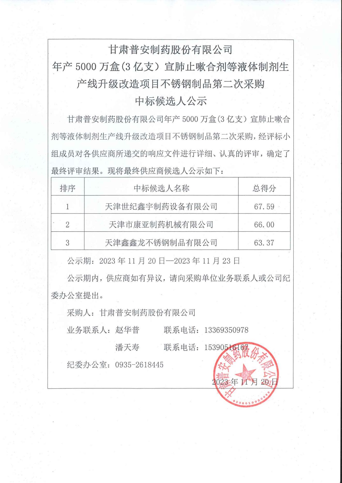 甘肅普安制藥股份有限公司年產5000萬盒(3 億支)宣肺止嗽合劑等液體制劑生產線升級改造項目不銹鋼制品第二次采購中標候選人公示