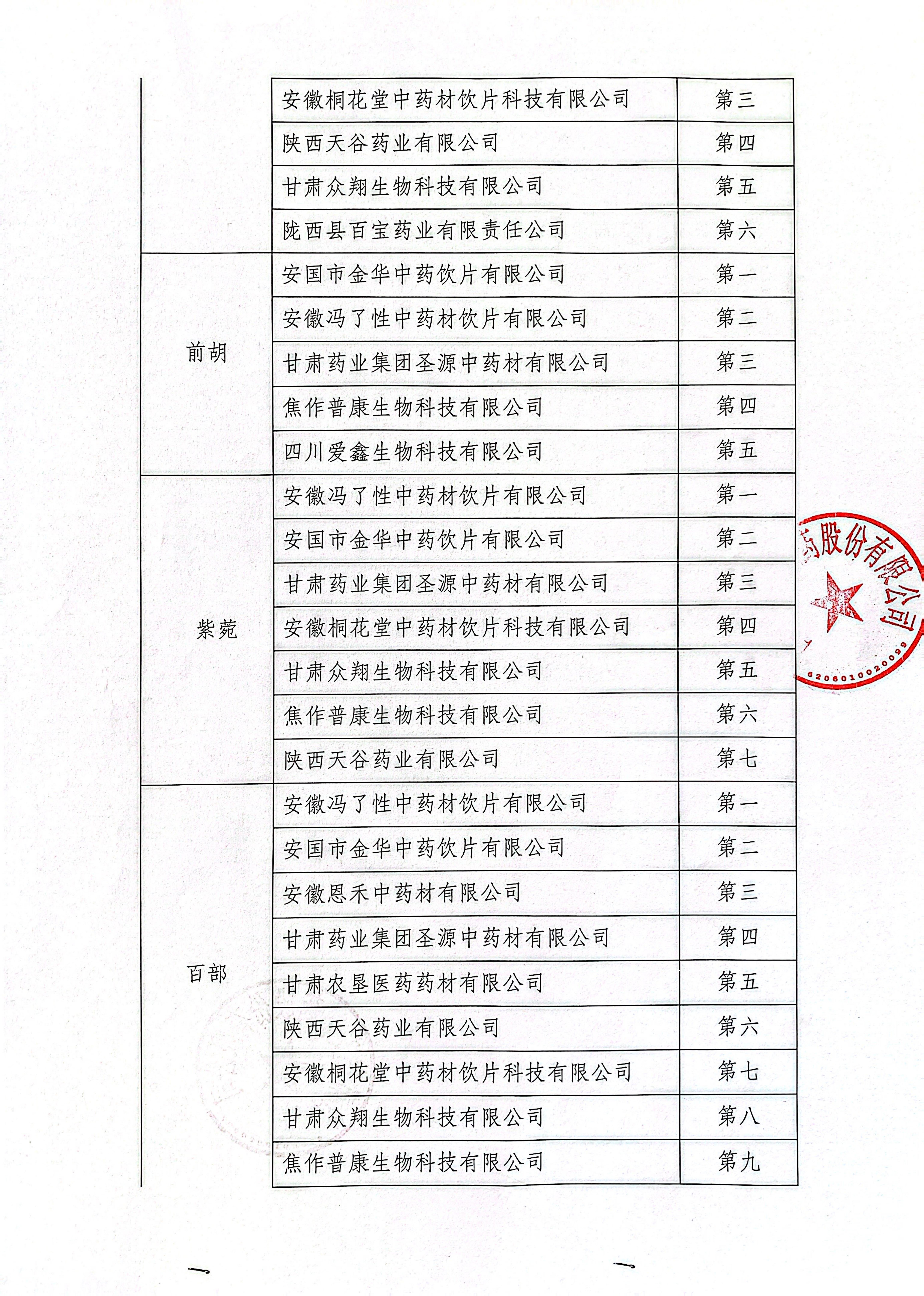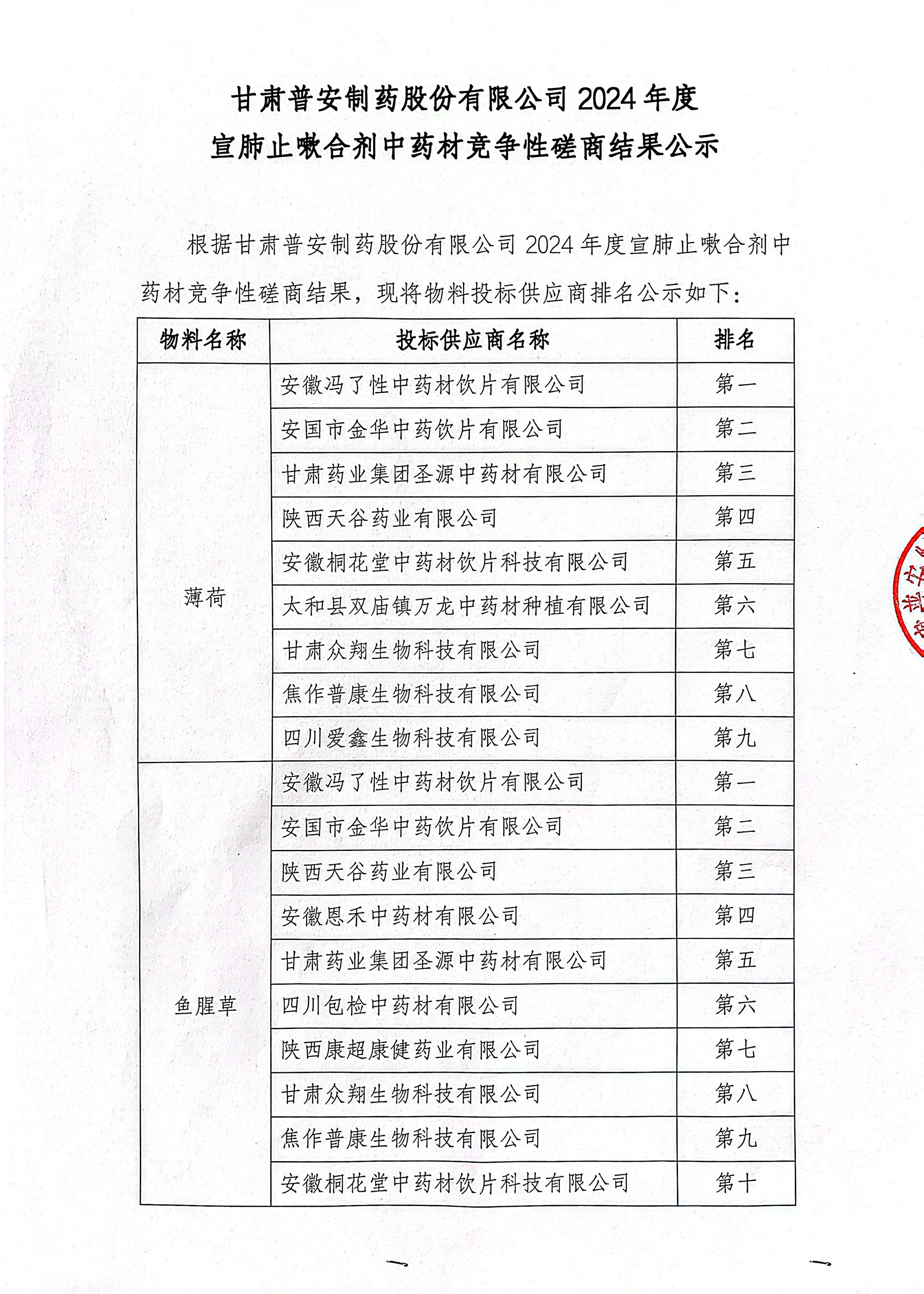 甘肅普安制藥股份有限公司2024年度宣肺止嗽合劑中藥材競爭性磋商結果公示