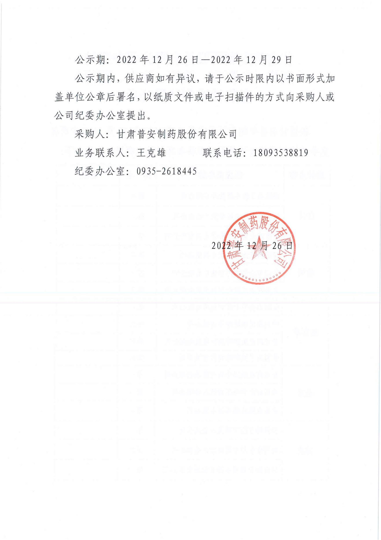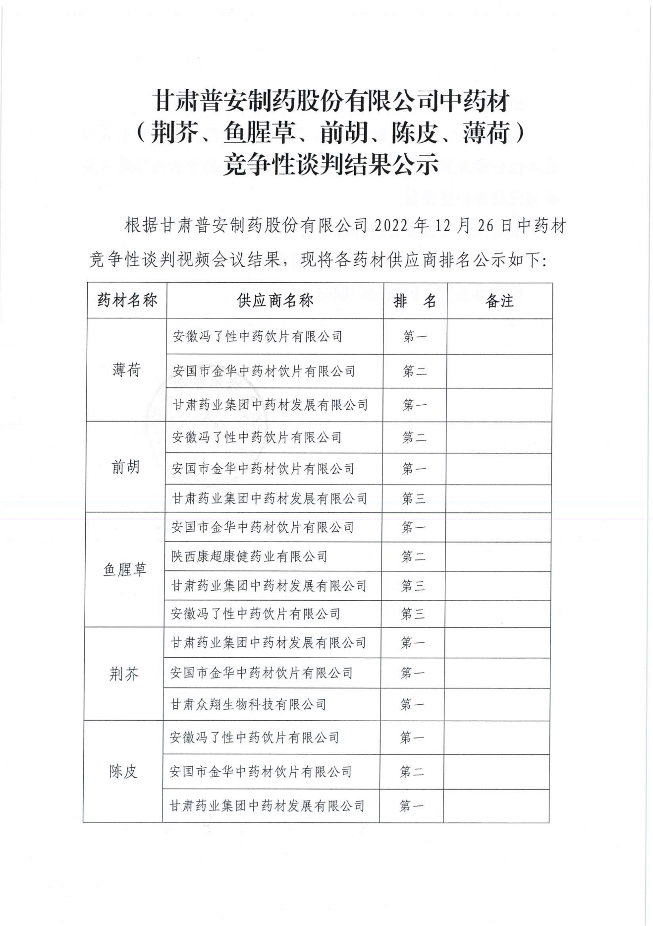 甘肅普安制藥股份有限公司 中藥材(荊芥、魚腥草、前胡、陳皮、薄荷)競爭性談判結果公示