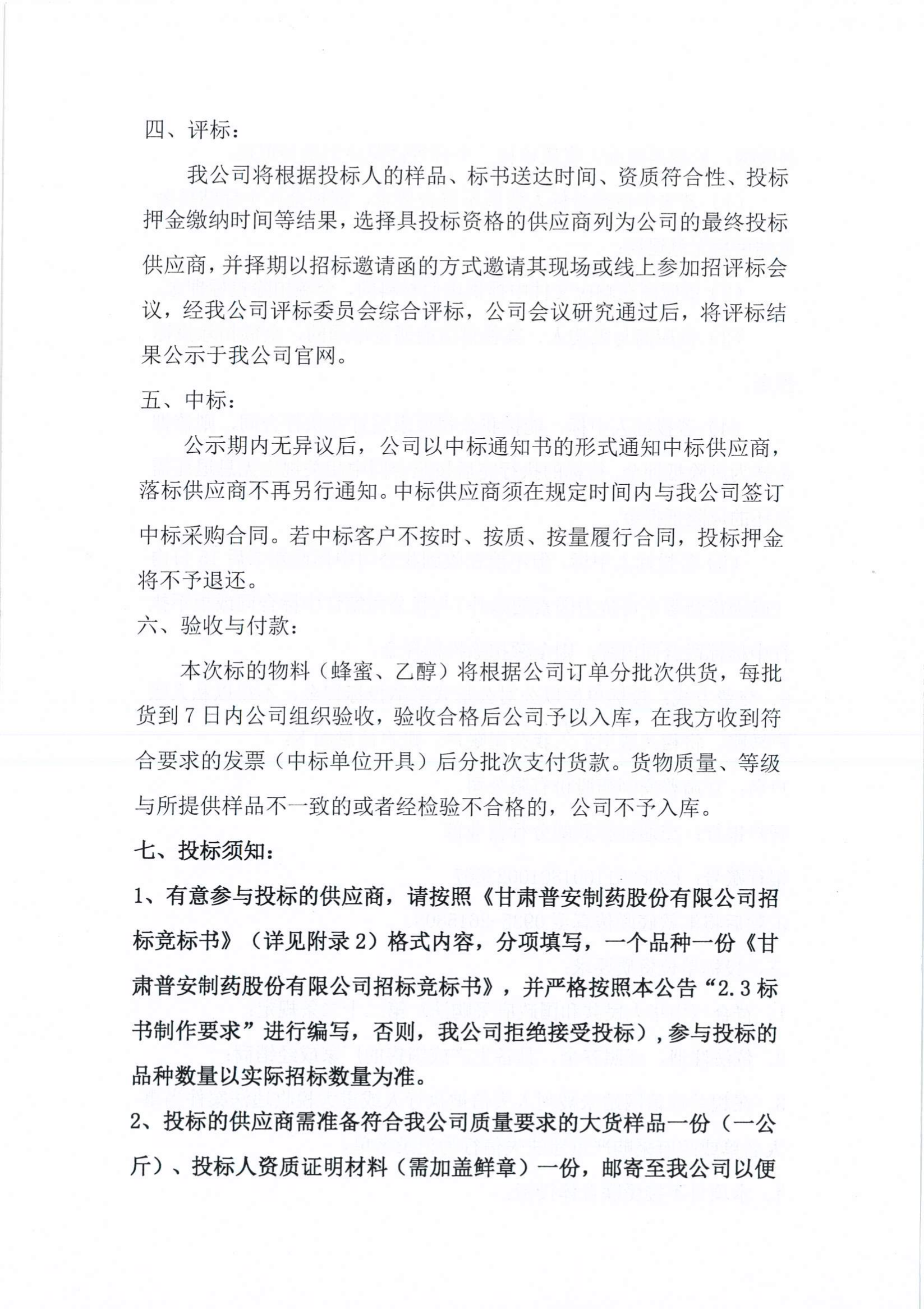 甘肅普安制藥股份有限公司2023年宣肺止嗽合劑物料(蜂蜜、乙醇)招標(biāo)采購公告