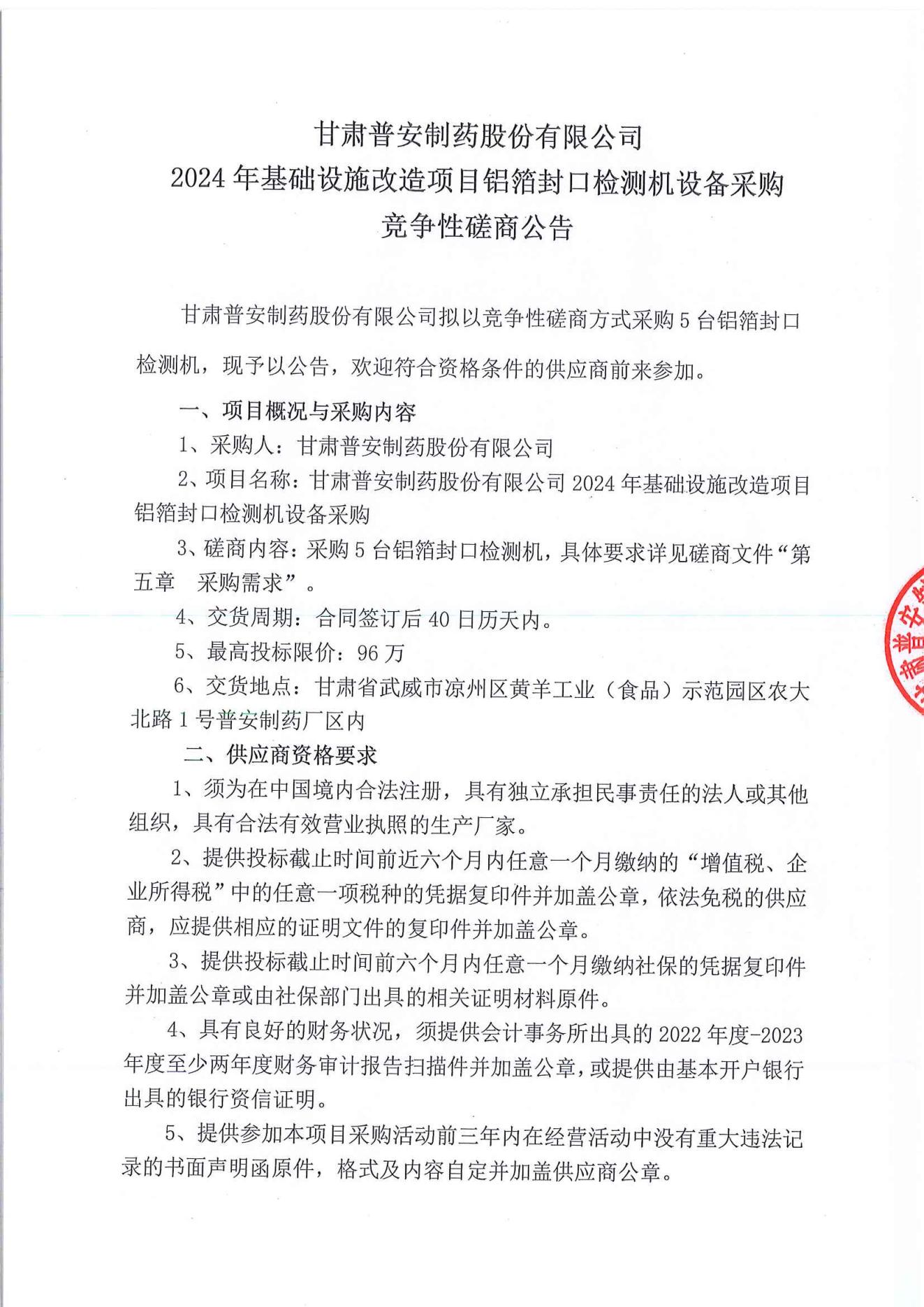 甘肅普安制藥股份有限公司2024年基礎設施改造項目鋁封口檢測機設備采購競爭性磋商公告
