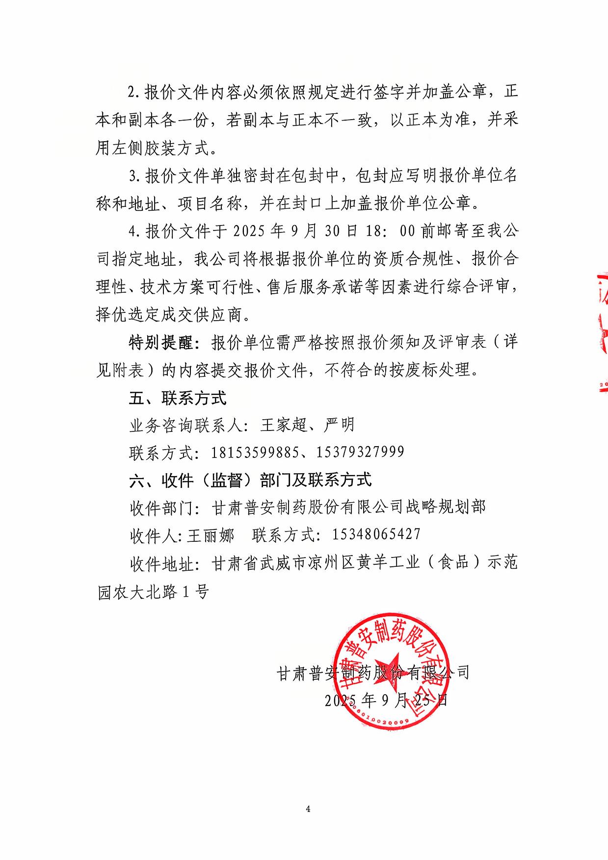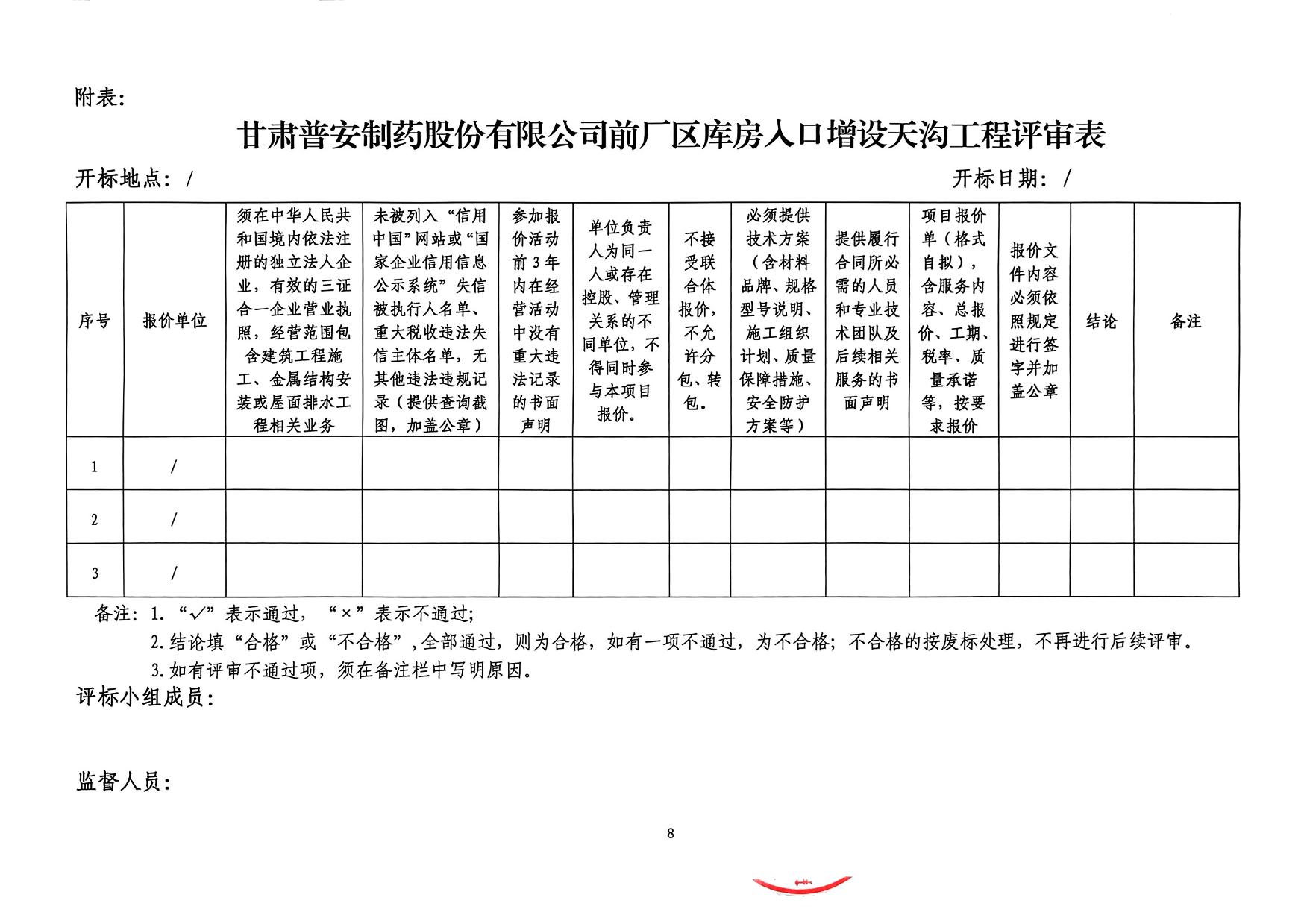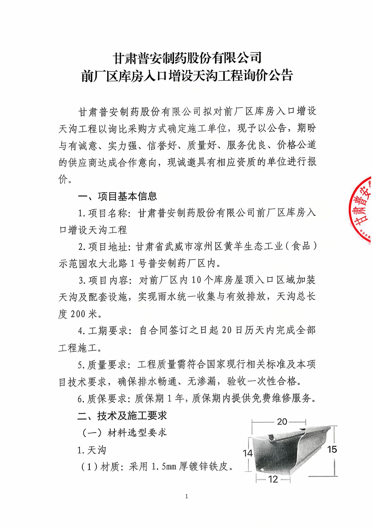 甘肅普安制藥股份有限公司前廠(chǎng)區(qū)庫(kù)房入口增設(shè)天溝工程詢(xún)價(jià)公告