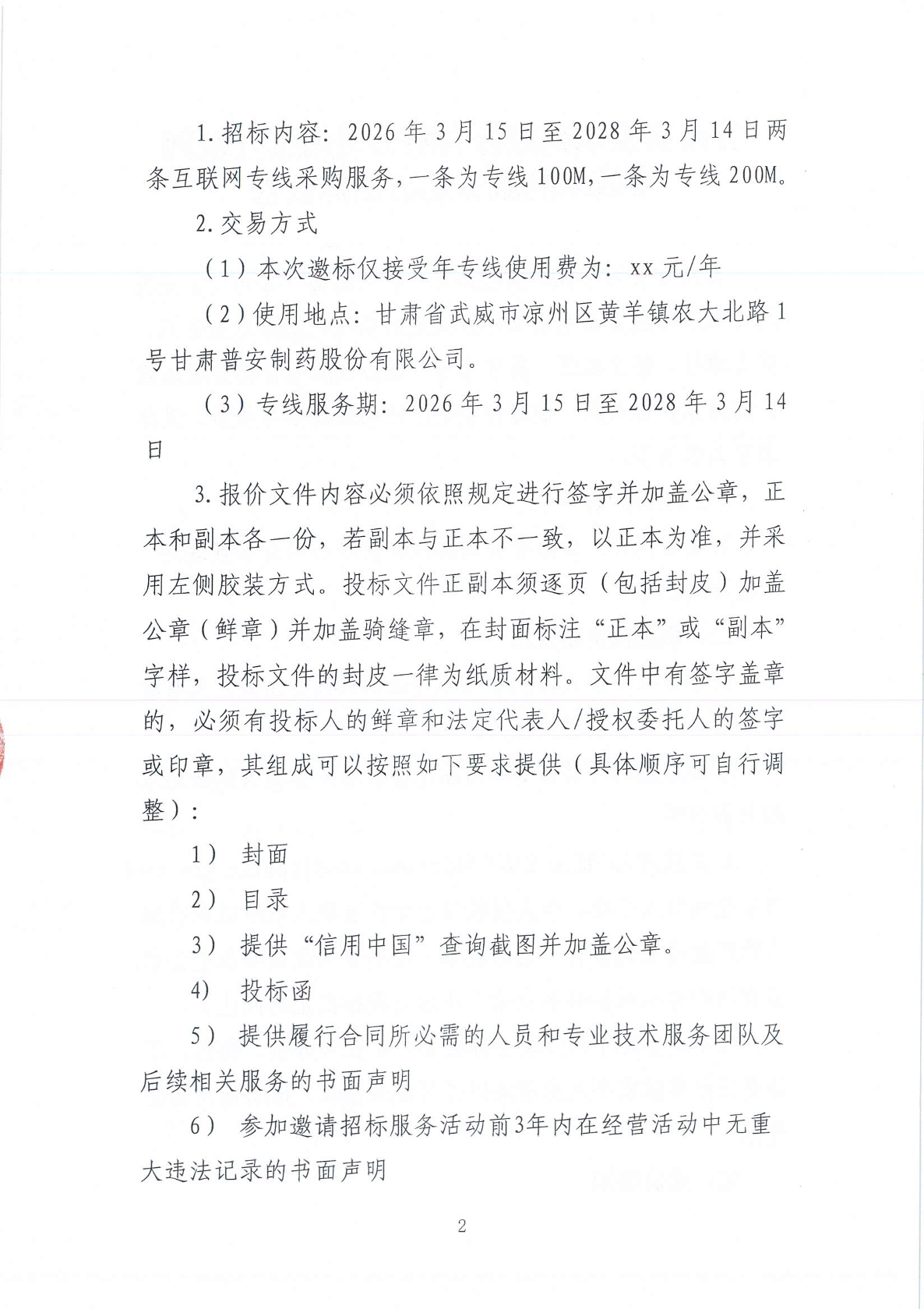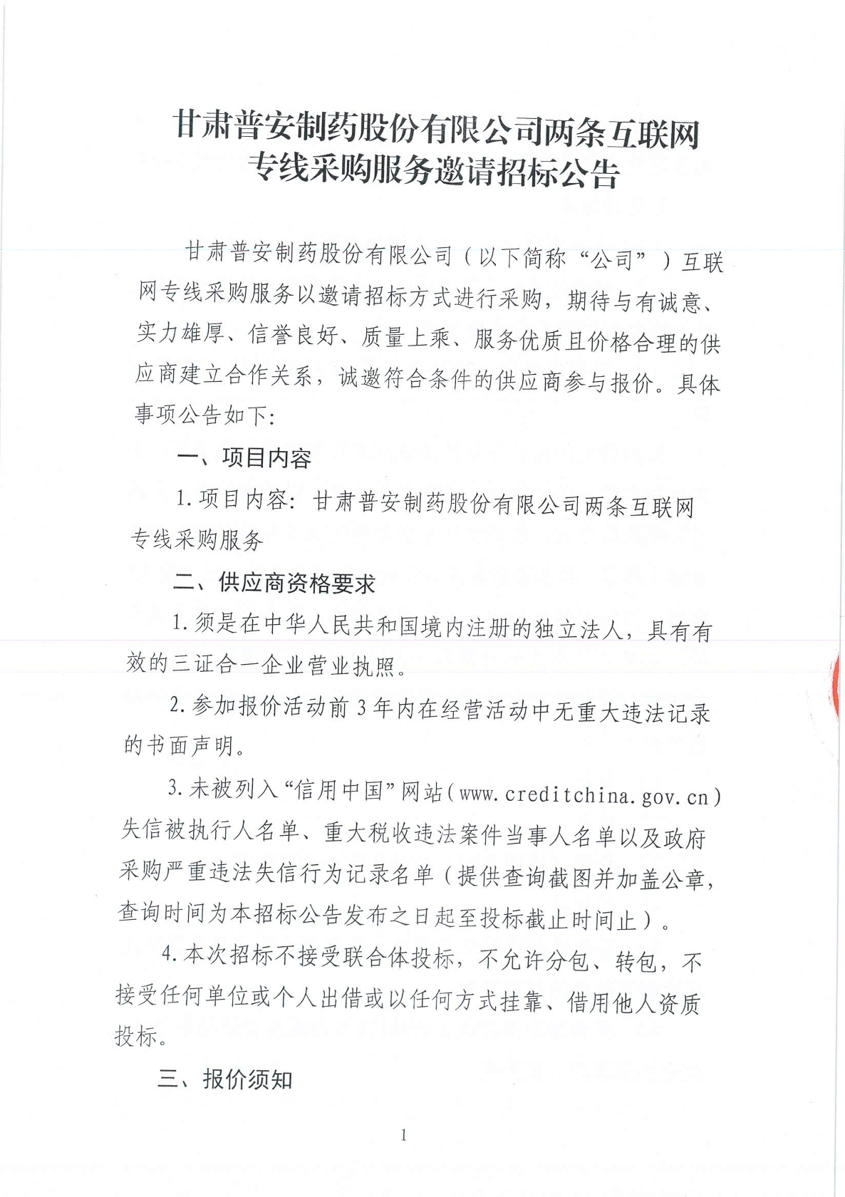 甘肅普安制藥股份有限公司兩條互聯(lián)網(wǎng)專線采購(gòu)服務(wù)邀請(qǐng)招標(biāo)公告